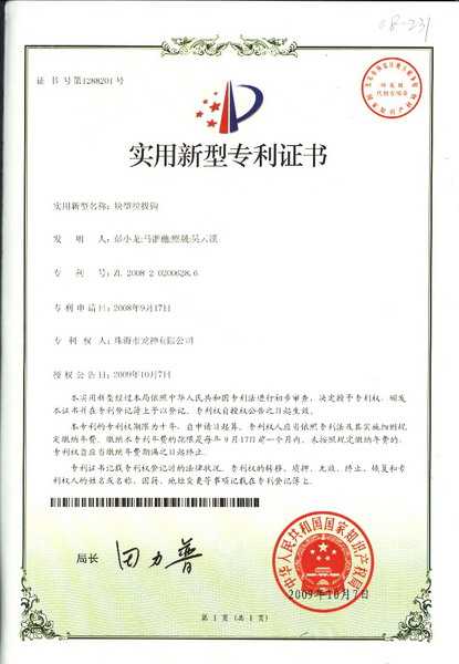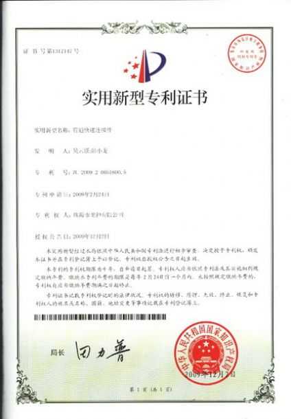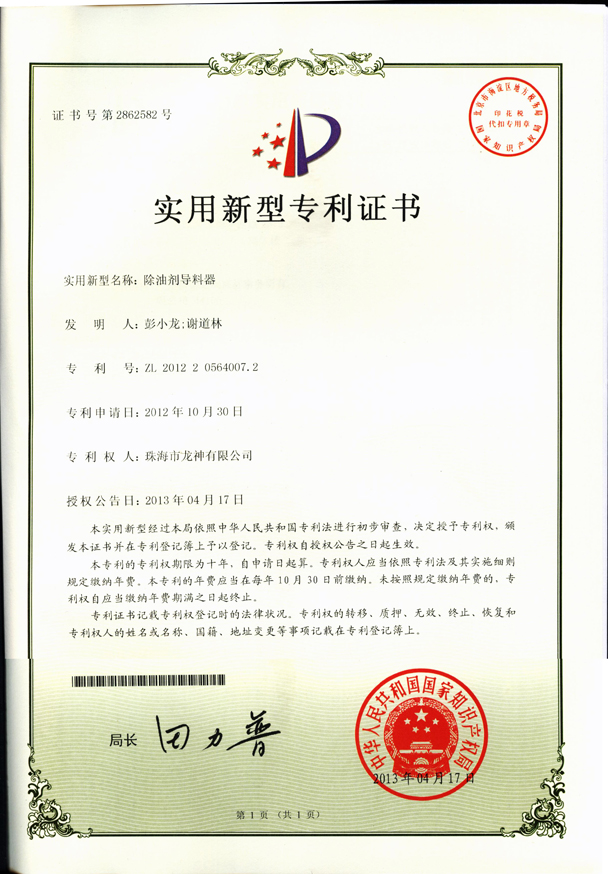 除油劑導(dǎo)料器專利證書