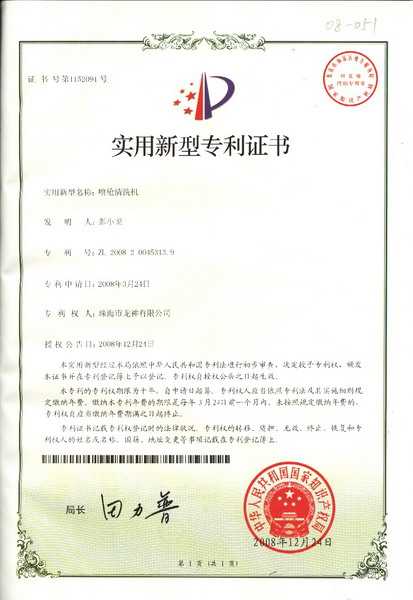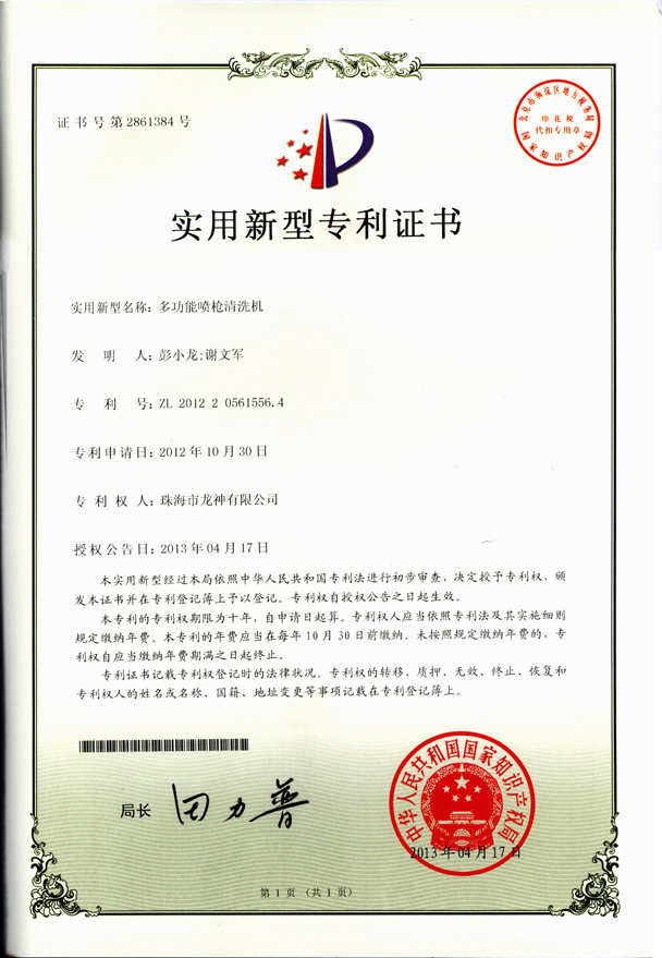 噴槍清洗機(jī)專利證書