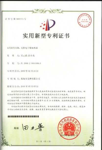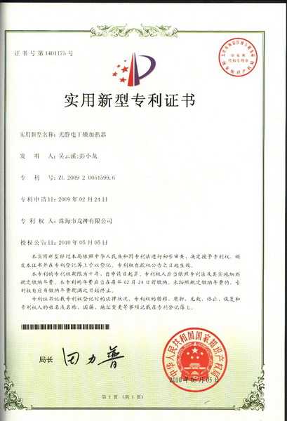 無靜電干燥加熱器專利證書