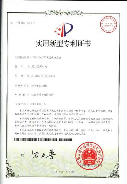 壓縮空氣空壓機(jī)房供應(yīng)系統(tǒng)專利證書