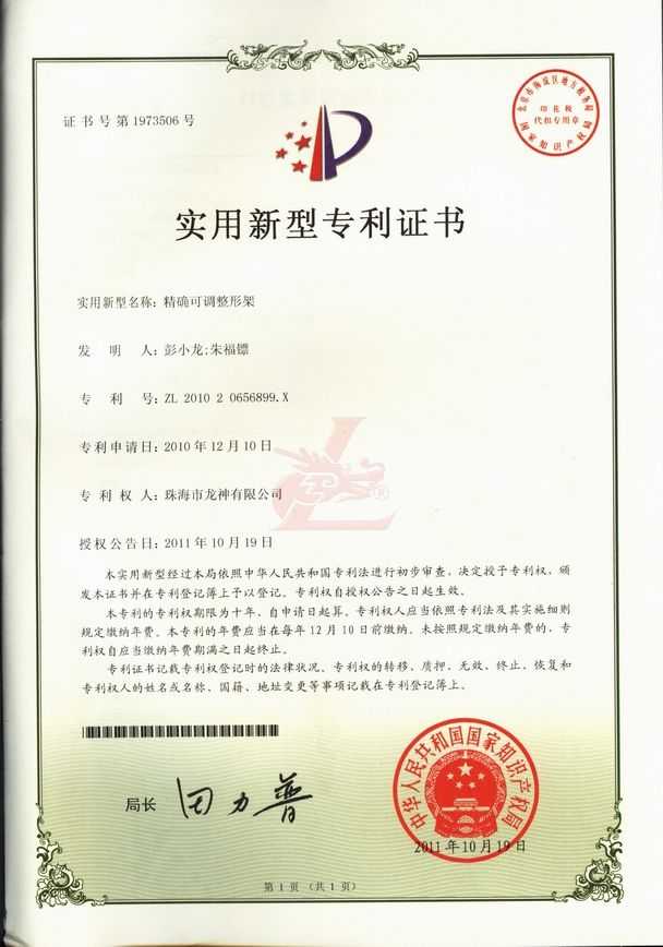 精確可調(diào)整形架專利證書