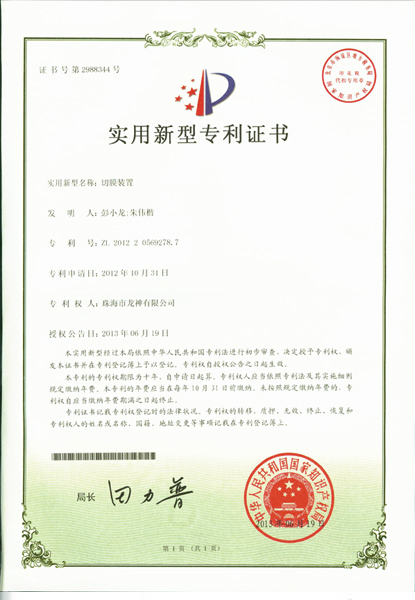 一種自動(dòng)測量切膜架專利證書