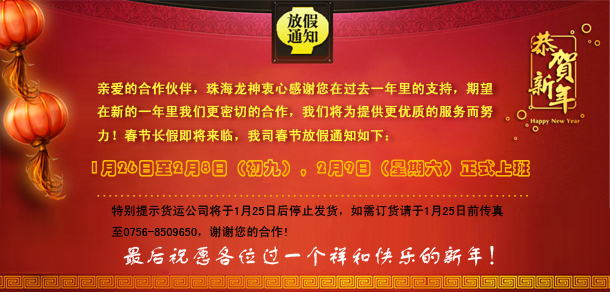 新年好!龍神祝您新年生意興隆!我司已上班, 將繼續(xù)竭誠(chéng)為您服務(wù),恭候您的惠臨及來電0756-8509651 、8509652、8509653