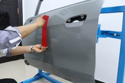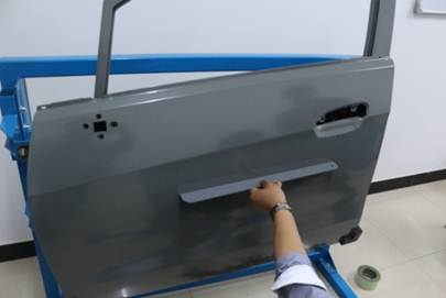 在40分鐘內(nèi),對雪佛蘭新賽歐左前門外板上的長80mm,寬40mm,深10mm的條形凹陷(漆膜已破壞)進行修復(fù),凹陷損傷穿過車身線。