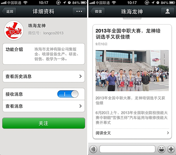 珠海龍神官方微信敬請關(guān)注! 珠海市龍神有限公司公共微信號已申請成功,請大家多多關(guān)注! 掃描二維碼,也可直接搜索公眾微信號“珠海龍神” 我們將不定期發(fā)布公司最新資訊。 您也可以發(fā)消息和我們進行互動。 查看歷史消息收看您錯過的動態(tài)新聞,讓您第一手掌握最新動態(tài)。 2013-09-18 16419